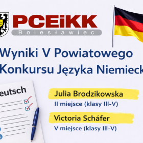 Z radością informujemy o wynikach V Powiatowego Konkursu Języka Niemieckiego dla uczniów klas I–V szkół ponadpodstawowych, organizowanego przez PCEiKK w Bolesławcu. Konkurs zgromadził wielu utalentowanych uczniów z powiatu, którzy zaprezentowali bardzo wysoki poziom znajomości języka niemieckiego.