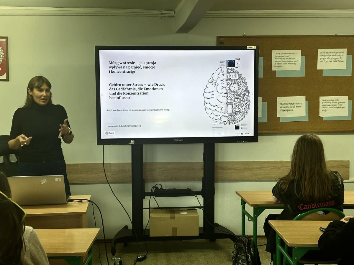 Podczas spotkania uczniowie poznali podstawowe struktury mózgu odpowiedzialne za reakcje stresowe oraz omówiono rolę hormonów stresu, takich jak kortyzol i adrenalina. Zwrócono szczególną uwagę na to, w jaki sposób długotrwały stres może negatywnie wpływać na zdolność zapamiętywania, skupienia uwagi oraz kontrolę emocji.