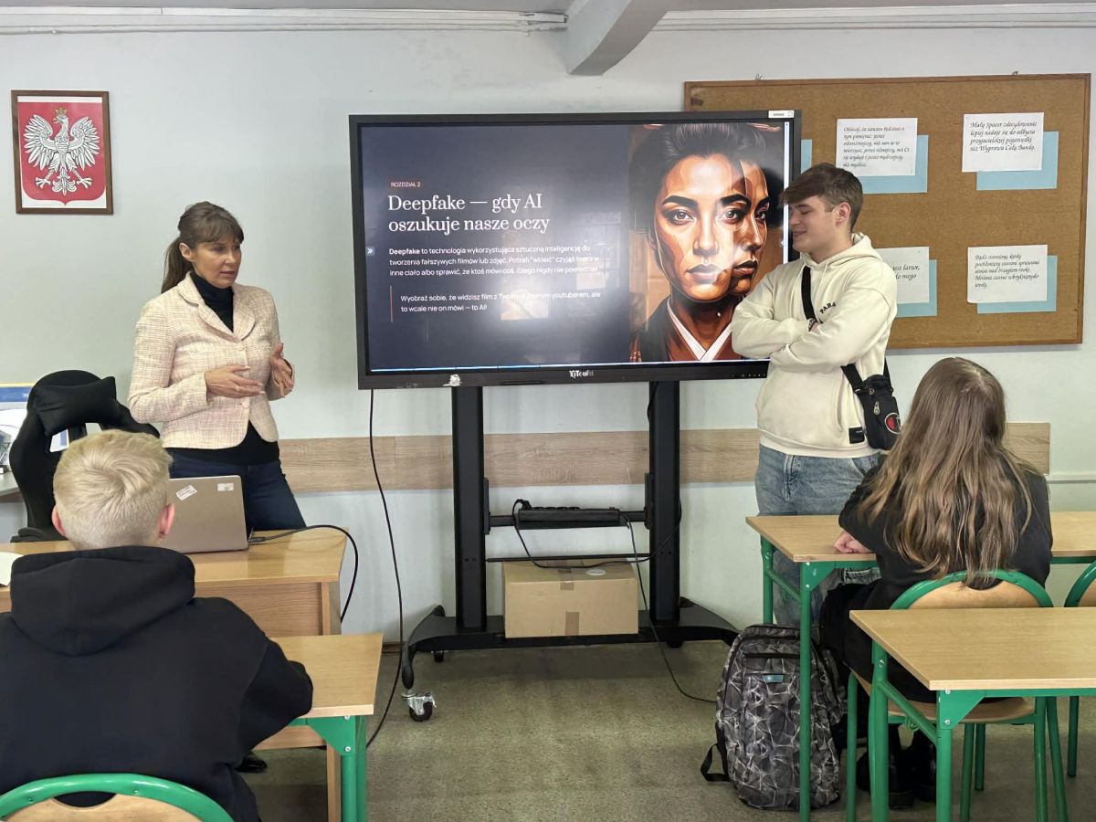 Szczególne zainteresowanie wzbudził temat deepfake’ów – materiałów audio i wideo generowanych przy użyciu sztucznej inteligencji. Uczniowie poznali zasadę działania tej technologii oraz dowiedzieli się, jakie elementy mogą świadczyć o cyfrowej manipulacji (nienaturalna mimika, zaburzenia synchronizacji dźwięku i obrazu, nielogiczne detale w tle). Dyskusja dotyczyła również roli sztucznej inteligencji we współczesnym świecie – jej potencjału jako narzędzia wspierającego naukę i rozwój, ale także możliwych zagrożeń wynikających z nieodpowiedzialnego wykorzystania.