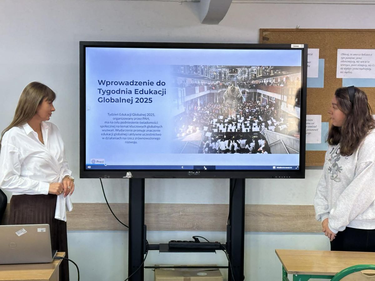 W dniu 21 listopada 2025 r. uczniowie klasy 4 TŻH oraz przedstawiciele klasy 4 TE uczestniczyli w zajęciach prowadzonych przez panią Edytę Chomiaczewską w ramach Tygodnia Edukacji Globalnej realizowanego z PAH. Punktem wyjścia do pracy była wystawa „W innym świetle”, która w przystępny sposób ukazuje globalne współzależności, migracje, różnorodność oraz wpływ naszych codziennych wyborów na świat. Zajęcia miały na celu rozwijanie świadomości globalnej, umiejętności krytycznego myślenia oraz refleksji nad tym, jak wydarzenia na świecie łączą się z naszą codziennością. Uczniowie pracowali nad zrozumieniem zjawisk migracyjnych i przełamywaniem stereotypów. Uczniowie zapoznali się z wystawą, a następnie w krótkich grupach omawiali wybrane zagadnienia dotyczące migracji i globalnych powiązań. Każda grupa sformułowała własny wniosek lub hasło podsumowujące najważniejsze refleksje. Młodzież zwróciła uwagę na znaczenie świadomych wyborów, wpływ globalnych procesów na życie jednostki oraz konieczność patrzenia na migrację i różnorodność w sposób wolny od schematów.