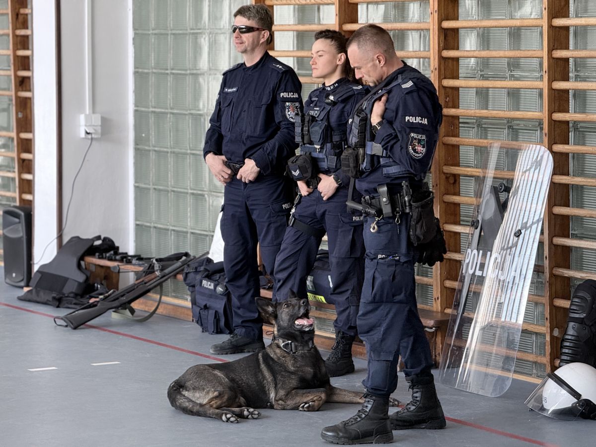 Dużym zainteresowaniem cieszyła się część praktyczna spotkania. Uczniowie mieli okazję zobaczyć sprzęt wykorzystywany w codziennej służbie, w tym wyposażenie ochronne oraz środki przymusu bezpośredniego. Funkcjonariusze opowiedzieli również o zasadach bezpiecznego i odpowiedzialnego posługiwania się bronią służbową.